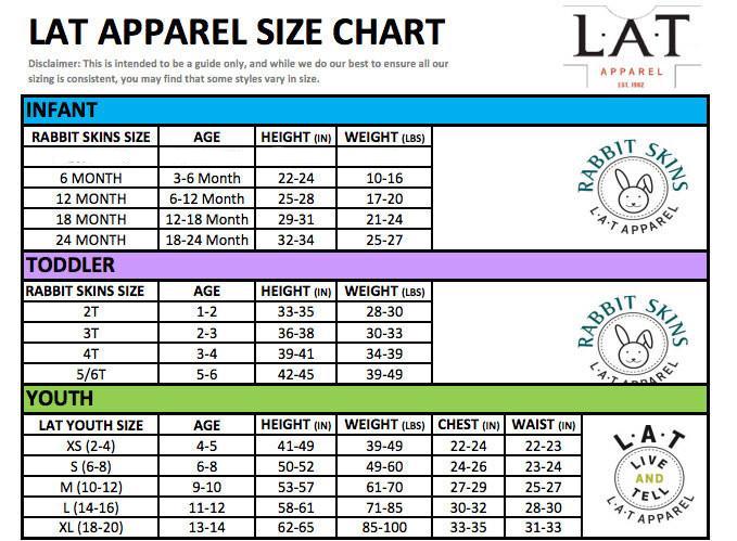 Kid's tees are printed on Rabbit Skins, LAT, or Bella Canvas Tees.